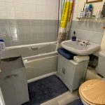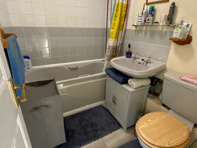 BATHROOM: Coloured bathroom suite with panelled bath & electric shower over, low level w.c., pedestal wash basin.