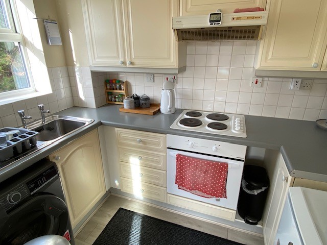 KITCHEN: Fitted kitchen comprising of stainless steel sink & drainer with cupboard under, range of base untis with cupboards & drawers, eye level wall units, electric oven & hob with extractor hood over, laminated work surfaces & tiled splash backs, window to side aspect.